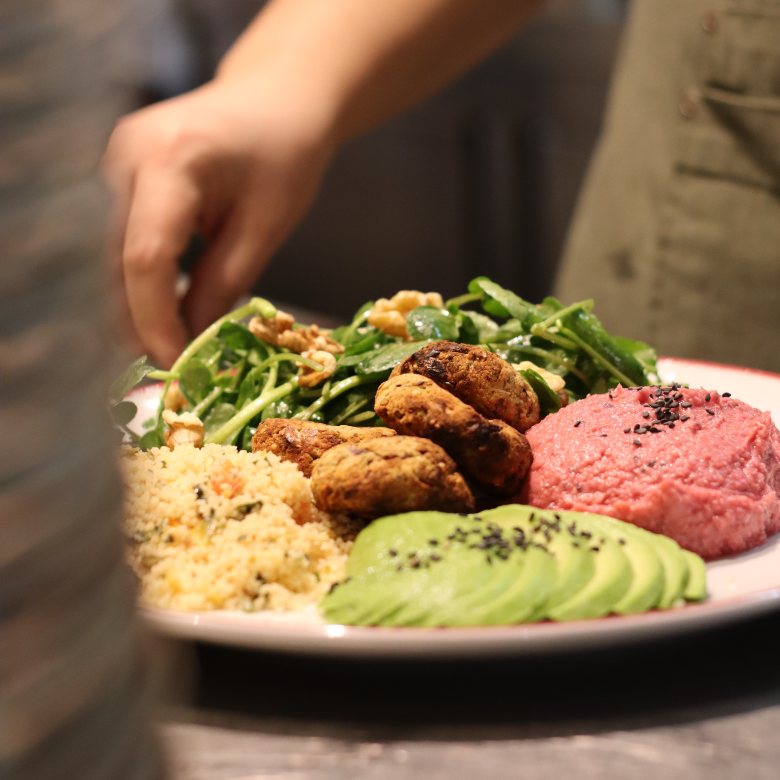A Cyprus com falafel, tabouleh, hummus, abacate, agrião e nozes. Sem dúvida, sabores surpreendentes que nos fazem viajar!